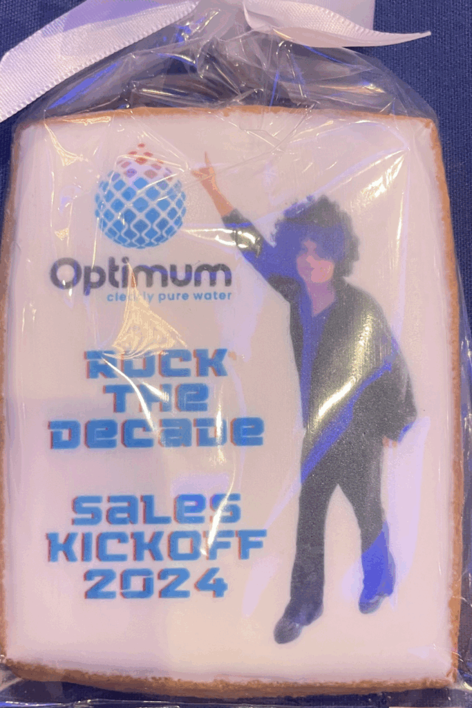 We were so thrilled to have our cookies featured the entire weekend of a large corporate yearly “kickoff” event. Optimum Water Solutions, a business-to-business bottle-less drinking water solutions company, with offices up and down the East Coast, hosted their yearly sales motivation and sales learning “kickoff” event in Orlando, Florida in early January. It was important to the Optimum team to go “over-the-top” with branded paraphernalia for their entire sales team and vendors in attendance, with swag bags full of branded goodies, as well as various themed events. We were equipped with a rather large budget and left in charge of showering all 50 guests with Really Good Cookies for a three-day extravaganza.