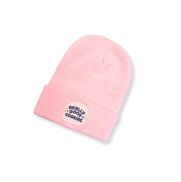 This pink beanie is warm, luxe, and embroidered with our Really Good Cookies logo. A Really Good way to get heads to turn.